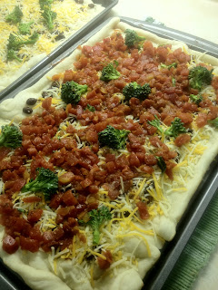 This was the first time either Betty or Tony had used the refrigerated pizza crust.. it was a fun learning experience. You'll need a cookie/baking sheet that is 15x10 inches. ACTUALLY... you'll need TWO of them. Unroll the pizza crust into the two baking sheets. One trick that we used here was to put a very light layer of olive oil on the baking sheets. This would help the pizza crust not stick and also add some flavor to the crust!